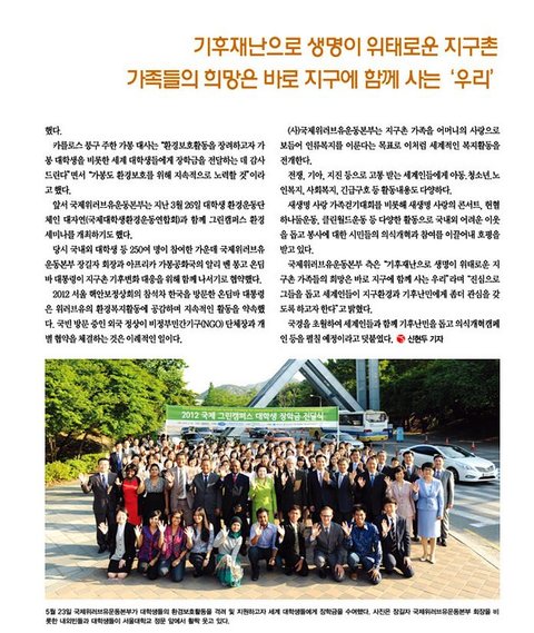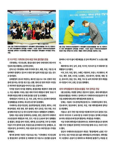 세계기후난민 돕기, 클린월드운동, 세계 대학생들 환경장학금 전달.....
