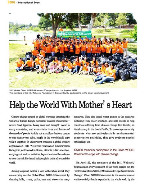 지난 4월 29일에는 세계 전 대륙에 있는 국제위러브유운동본부 회원들이 나서 '2012 기후변화 대응을 위한 전 세계 클린월드운동'을 전개했다. 클린월드운동(Clean WORLD Movement)은 국제위러브유운동본부가 범세계적으로 확대해나가는 환경복지활동이다. 미국 시카고 노스애버뉴비치에서 200여 명이 정화활동을 벌인 것을 비롯해 독일, 영국, 스페인, 이탈리아, 프랑스, 아르헨티나, 멕시코, 페류, 칠레, 브라질, 호주, 뉴질랜드, 인도네시아, 필리핀, 네팔, 일본, 캄보디아, 태국, 몽골, 대만, 인도, 베냉, 가나 등 각 나라에서 현지 회원들과 시민들이 산, 바다, 거리, 공원, 강 등 주변환경을 정화했다. 12만 5천 명이라는 많은 이들이 동참했다.