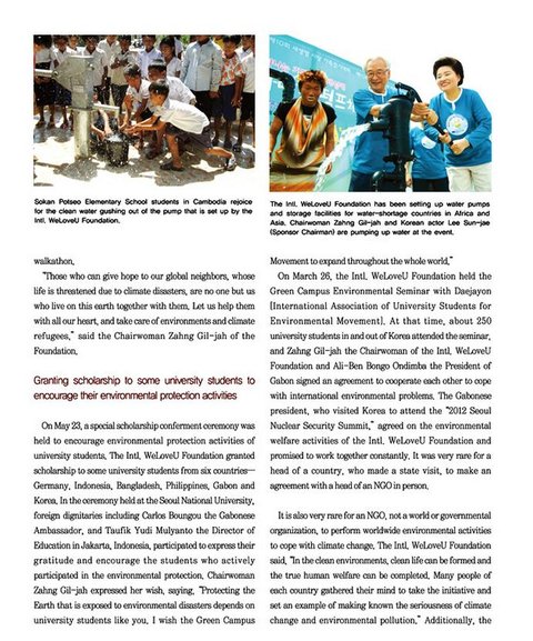 5월 23일에는 세계 대학생들의 환경보호활동을 격려하는 특별장학금 전달식이 있었다. 국제위러브유운동본부가 한국을 포함해 독일, 인도네시아, 방글라데시, 필리핀, 가봉 등 세계 6개국 대학생들에게 장학금을 전달한 것, 한국 서울대학교에서 열린 전달식에는 카를로스 붕구 주한 가봉 대사를 비롯해 타우픽 유디 물얀토 인도네시아 자카르타 시 교육국장 등 각 나라 인사들도 참석해 고마움을 표시하고 환경보호에 열심히 활동하는 학생들을 격려했다. 장길자 회장은 "환경재앙에 노출된 지구를 지키는 것은 여러분 같은 젊은 대학생들의 손에 달렸다. 대학생들의 그린캠퍼스 운동이 전 세계적으로 확대되면 좋겠다"는 바람을 전했다. 국제위러브유운동본부는 지난 3월 26일 대학생 환경운동단체인 대자연(국제대학생환경운동연합회)과 함께 그린캠퍼스 환경세미나를 개최하기도 했다. 당시 한국과 세계 각국 대학생 등 250여 명이 참여한 가운데 국제위러브유운동본부 장길자 회장과 아프리카 가봉공화국의 알리 벤 봉고 온딤바 대통령이 지구촌 기후변화대응을 위해 함께 나서기로 협약했다. 2012 서울 핵안보정상회의 참석차 한국을 방문한 온딤바 대통령은 위러브유의 환경복지활동에 공감하며 지속적인 활동을 약속했다. 국빈 방문 중인 외국 정상이 비정부민간기구(NGO)단체장과 개별 협약을 체결하는 것은 이례적인 일이다.