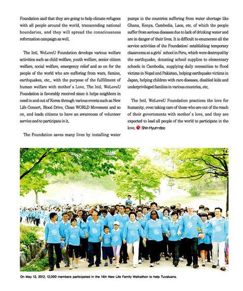남태평양 섬나라 투발루는 지구온난화로 인한 해수면 상승으로 국토 전체가 바닷물에 침수되고 있다. 이에 투발루를 시작으로 세계기후난민을 돕기 위해 국제위러브유운동본부 회원들이 발걸음을 내딛었다. 5월 13일 한국 서울에서 열린 '세계기후난민돕기 제14회 새생명 사랑 가족걷기대회'에는 1만 2천여 명이 참여했다. 직장인, 대학생, 주부, 중고등학생, 초등학생, 부모 손을 붙잡고 나온 어린 유아들까지 지구촌 이웃을 위한 따뜻한 행보에 동참했다. 평범하지만 특별한 사람들을 격려하기 위해 한국의 탤런트 이순재, 이배근 중앙입양정보원장(전 청소년진흥센터 이사장), 탤런트 김성환을 비롯해 마가렛 클라크 퀘세 주한 가나 대사, 하리반 우워든 주한 네덜란드 투자청장 등 주한외국공관과 각계 인사들도 함께 했다. 국제위러브유운동본부 장길자 회장은 "기후재난으로 생명이 위태로운 지구촌 가족들의 희망은 지구에 함께 사는 우리"라며 "진심으로 그들을 돕고 세계인들이 지구환경과 기후난민에게 관심을 갖도록 하자"고 밝혔다.
