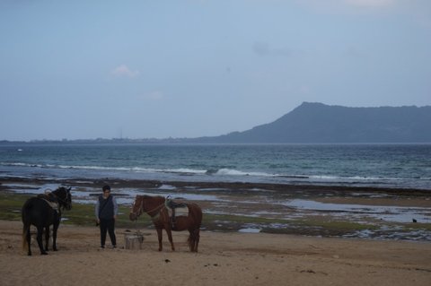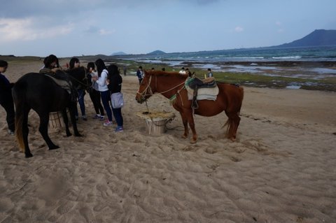해변가 백사장에서 말이 풀을뜯고있었음... 수학여행 온 고딩들이 무슨 나무판자같은걸로