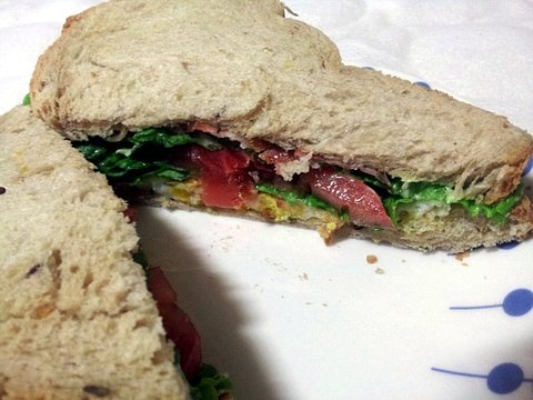 베이컨 토마토 양상추를 넣고 만든 샌드위치에요. 만들기도 아주 편함!