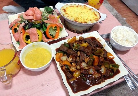 찹스테이크, 연어샐러드, 감자그라탕>.<