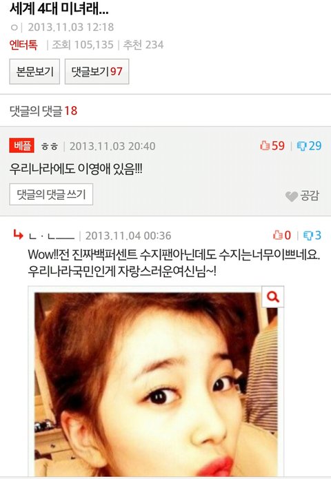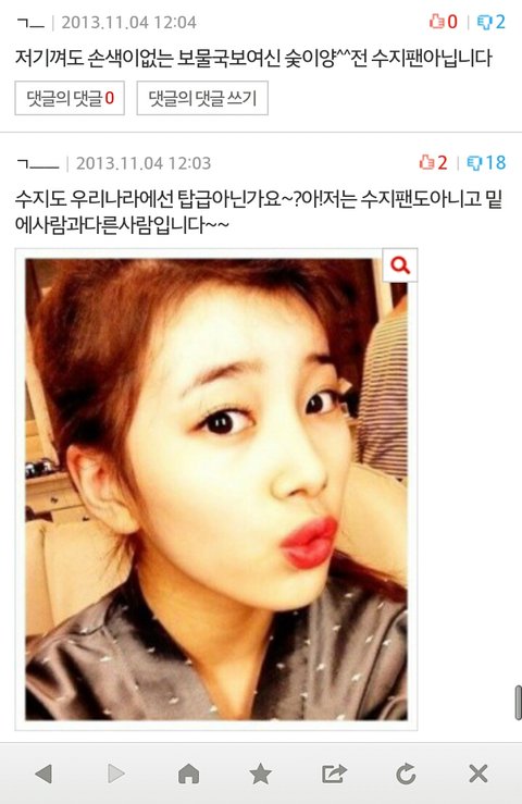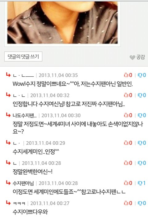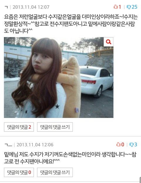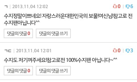 수지팬들이 무개념이라는게아니라 이댓글쓴사람 자기혼자 밑에쓴댓글 나만웃곀ㅋㅋㅋㅋㅋ?ㅋㅋㅋ자꾸 '참고로저수지팬아닙니다~~'이럼ㅋㅋㅋㅋ한사람인거티나는뎈ㅋㅋㅋㅋ