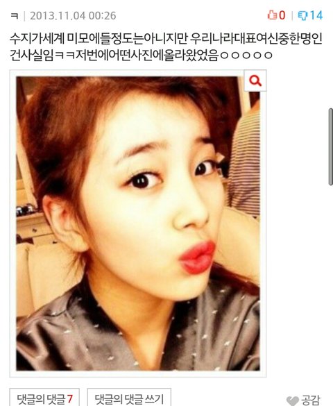 ㅋㅋㅋㅋㅋㅋㅋㅋㅋㅋㅋㅋㅋㅋ계속 수지팬아니라고 하는것도 웃긴데 빵터진건 수지가 우리나라의 자랑스런 보물이랰ㅋㅋㅋㅋㅋㅋㅋㅋㅋㅋㅋㅋㅋㅋㅋㅋㅋㅋ 수지랑 같은 대한민국 국민인게 자랑스럽뎈ㅋㅋㅋㅋㅋㅋㅋㅋㅋㅋㅋㅋ