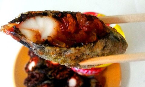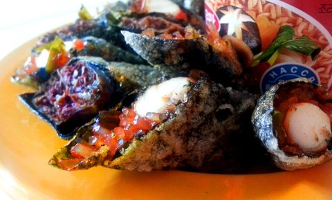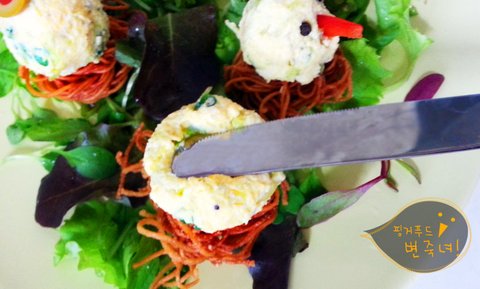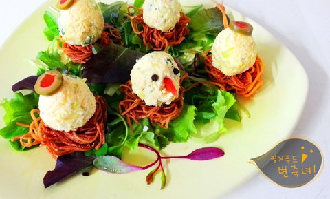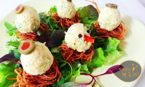 국수를 삶아 돌돌말아 튀기고 크림치즈와 삶은계란을 갈아만든 까나페의 일종.