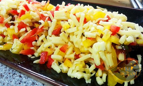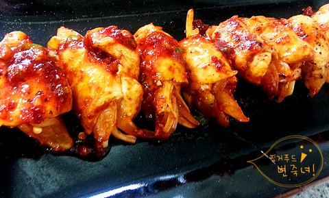 닭안심살을 양파넣고 돌돌말아 불닭을 굽고 치즈와 파프리카를 육덕지게 뿌려 돌린 요리.