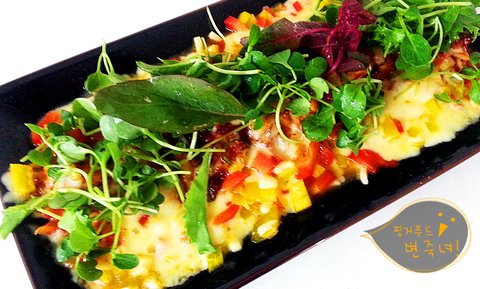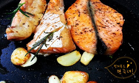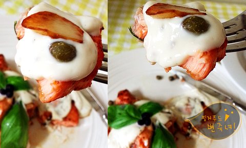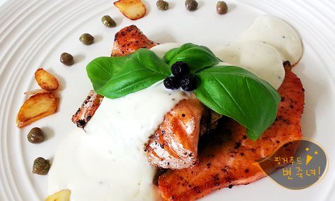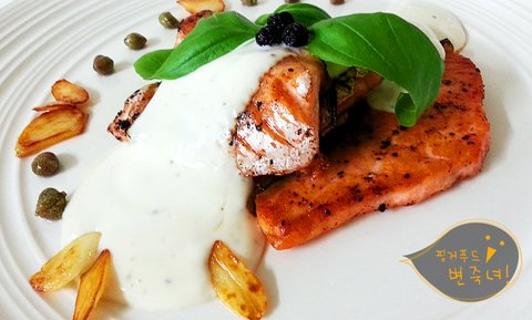 핑거푸드계의 김연아가 만드는 스테이크계의 김연어선수. 간장과 매실액을 살짝뿌려구운 연어에 두부와 요거트를 섞어만든 화이트소스가 매우 청순함.