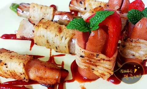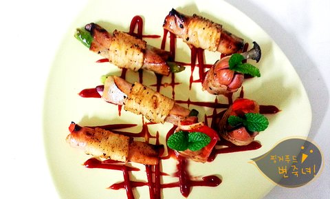 냉장고에 조금씩 남아있는 잡재료들을 칼국수면을 돌돌말아 구워낸 요리.