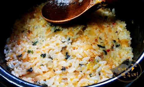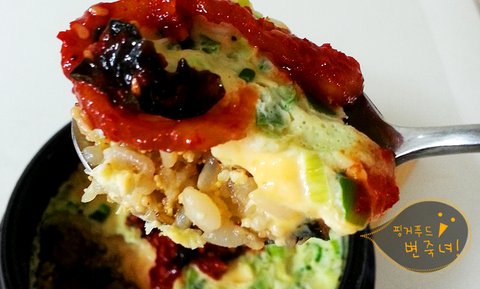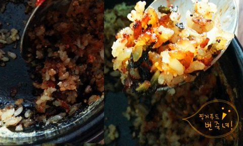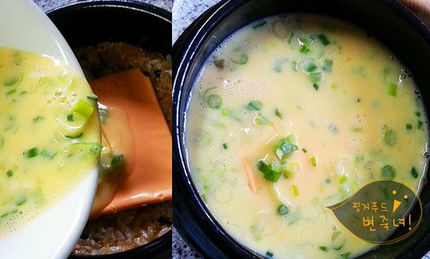 날치알밥과 계란찜의 합체. 날치알밥을 비벼 돌솥에 꾹꾹 담아주고 달걀물을 부어 이층 계란찜을 완성. 계란찜이 다 익었을때 불을 꺼서 퍼먹으면 바닥은 누룽지가 되어있는 굿타이밍 요리.
