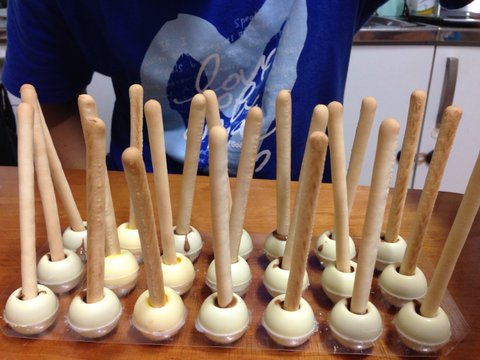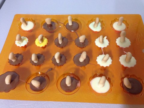 요곤 보노보노 빼빼로 만들기위한 화이트쉘이라는것에 빼빼로과자를 꽂기위해 속에 초코넣는중