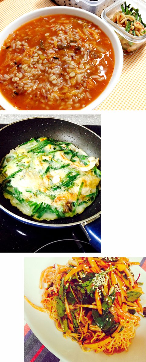 ▶요것들은 김치국밥과 해물부추전, 비빔면입니다.