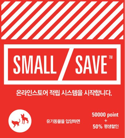 반려동물을 사지 말아주세요. 이효리가 외치는 당당한 부탁. 스몰스앤코라는 디자인 애견용품 브랜드는 이러한 유기견을 돕는 캠페인에 당당히 참여하고 있다. 영리를 목적으로 한다면 할 수 없는 아름다운 캠페인인 스몰세이브는 유기견을 입양한 사람들에게 평생동안 반값으로 제공하는 실천을 하고 있다.