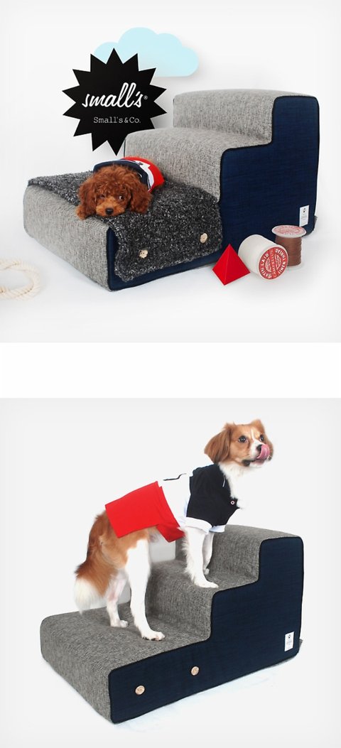 높은 곳을 편하고 안전하게 오르내리게 하기 위한 스텝으로 집에서 기르는 반려동물들이 종종겪는 슬개골 탈골문제를 위해 제작된 아이템, 전체를 덮은 스폰지가 계단 역할뿐 아니라 미니 침대로서 딱이다!