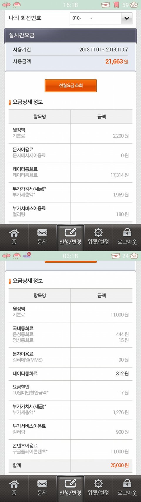 사진은, 1mb당 500원짜리 데이터를 덜컥 사용해 버린 이번 달의 실시간 요금과