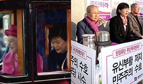 6일… 박근혜 대통령은 황금마차를 타고 버킹엄 궁에 들어가는 인생 최대의 호사를 하고, 그의 대통령 선거 상대였던 문재인은 검찰의 포토라인에 섰으며. 또 다른 대선 상대였던 이정희는 같은 당 국회의원들의 삭발단식장에서 섰다.