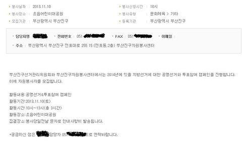 자원 봉사자 대부분은 고등학생도 아닌 중학생들이였고 심지어 그 중에는 초등학생도 몇 있었습니다. 정치에 관심도 없고 자신의 가치관도 아직 형성되지 않은 아이들입니다. 이런 아이들에게 별 다른 통보 없이 정치활동을 시키는게 이치에 맞다고 생각하십니까? 억울합니다. 자원봉사의 이름으로 학생들에게 정치운동을 시킨 부산진구 선관위와 봉사활동센터를 고발합니다!