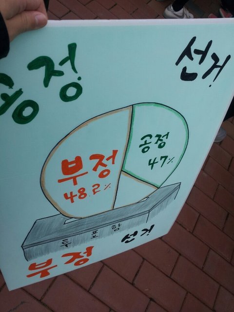 보이시나요? 저희는 정치적 활동을 하러 자원봉사를 신청한것이 아닙니다. 저 말고도 50여 명이 이 봉사 활동에 더 참가 했는데 투표 독려보다는 이런 내용의 박근혜 대통령은 부정선거를 했으니 나쁘고 하야해야한다. 문재인씨는 공정선거를 했으니 착한 사람이다 같은 내용의 피켓이 절대다수로 많았습니다. 이 피켓 말고도 비슷하게 박근혜씨의 득표율인 48.2% 옆에는 악마의 얼굴을 그려놓고 문재인씨의 득표율인 47% 옆에는 스마일 마크를 그려놓거나, 문재인씨를 닮은 남자 캐릭터가 박수를 받고 있는 그림이 그려진 피켓 등 6.4지방선거 투표 독려보다는 민주당을 위해서 정치 활동을 하고 있다는 느낌이 강했습니다. 이 때문에 피켓을 들고 있으며 이런 활동에 대해 불쾌함을 비춰내보이는 아이들도 몇 있었지만 대부분의 학생들은 아무렇지 않게 이 피켓을 들고 봉사활동을 했습니다.