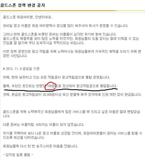 안녕하세요. 잘들 아시죠? 돈버는어플이라고.. 많이 들어 보셨을거에요 스마트폰이 상용화 되면서 어플이 주루루루룩 많이 생기기 시작했죠 돈버는어플들은 워낙 많아서 대표적으로 유명한게 애X라떼 골드스폰 캐X슬라이드 이런게 있죠.. 다들 1번씩은 들어보셨을겁니다 특히나 학생이시면 친구들이 " 야야 나 이거 추천 해줘 " 이런말을 많이 들어보셨을거에요 돈버는어플을 설명하자면, (광고가필요한)회사가 광고를 해주는 어플회사에게 자금을 줍니다 그러면 그 어플회사에서 광고를 해줍니다 광고를 보는 사람들은 적립금을 쌓을려는 사람들 이라고 보면 되겠습니다 (기프티콘,상품권,환급) 보통 이런류의 광고가 있습니다 앱설치광고 / 이벤트광고 / 페이스북 좋아요 누르기?? 이런거.. 앱설치광고가 제일 많아요 저는 자랑은 아니지만 돈버는어플로 지금까지 현금 150만원정도를 이득 봤습니다 거의 공짜로 얻은 셈이죠 골드스폰이라는 어플을 접하게 되었는데 이어플이 초기에 특급이벤트를 준비 했습니다 "사장님이 미쳤다"라는 타이틀을 가진 이벤트로 추천인이벤트 1000원이였죠 저는 추천을 받아서 총 150만원가량 있었습니다 45만원정도 현금화 했어요 나머진 빼기가 힘들어서.. 참고로 돈버는어플은 돈이 쌓여도 현금화 하기가 힘듭니다 1일 선착순 200명 이런식으로 환급기능이 있습니다 오전10시 시작 ~ 오후 9시 종료인가?? 말만 이렇지.. 사실상 오전 10:00 1초컷??입니다 어플하는 유저가 몇만명일텐데 ㄷㄷ.. 그래서, 골드스폰이 괜찮은 시스템을 추가 했는데 일명 자동입금 시스템이라고 어느정도 돈이 쌓인 회원들은 자신 계좌에 매월마다 회원등급만큼의 금액이 자동입금 되는 시스템 이였습니다 (한달마다 매월 말쯤에) 8월달부터 시행 되었어요 2달정도 계좌에 꼽히더군요 그런데..... 10월달 말이 지나가는데 입금이 안 되는겁니다. 기다리고 기다리고 기다리고.. 어느날 공지사항이 올라왔는데.