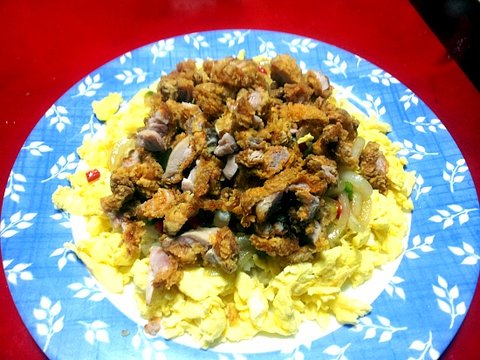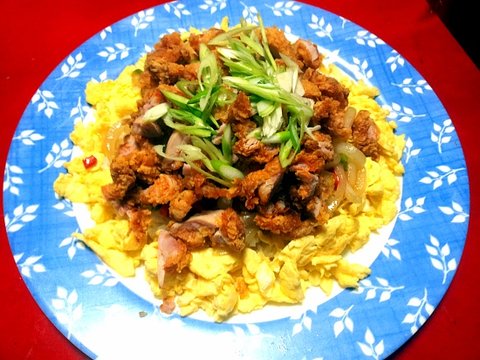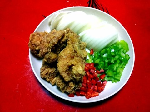 재료 : 먹다 남은 치킨 , 양파 1개 , 피망 및 파프리카 반개 , 계란 2개 , 대파(생략하셔도 무방)
