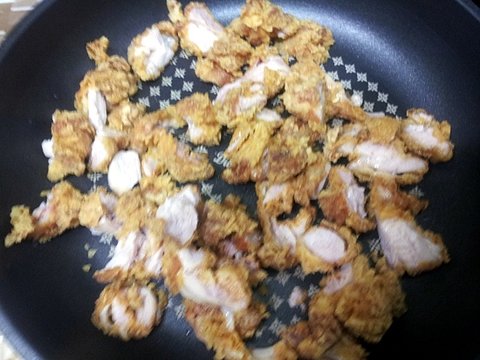 식은 치킨을 가위로 썰은 후에 후라이 팬에 넣어서 데워 줍니다.