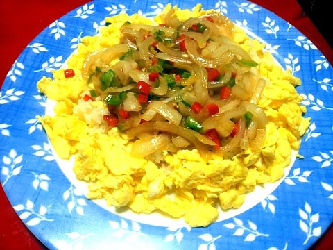밥 위에 데리야끼 소스로 간을 한 양파와 파프리카 , 피망을 올려주시고~