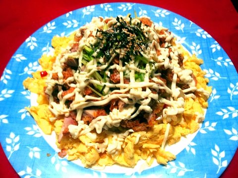 그 위에 마요네즈를 뿌려줍니다~ 마무리로 김가루도~ (마요네즈 뿌리기는 실패!)