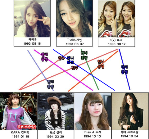 족보브레이커 강지영은 빠른년생. 강지영은 94년생 수지,크리스탈 ,설리랑 친구하면서 그녀들이 언니라고 부르는 지연,루나랑도 친구 먹음 ㅋㅋㅋ 그래서 엄청 꼬임 .