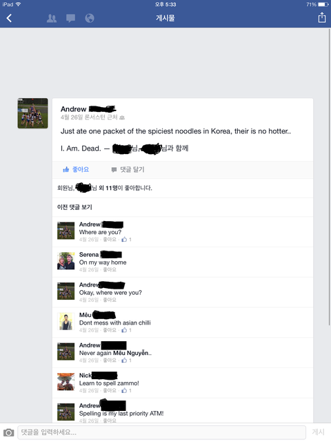 그리고 동영상은 공연 연습인데요 잘하죠?? ㅎㅎ댓글은 하나하나 읽어봤습니다정말 감사합니다 ㅠㅠ안녕하세요 앤드루한테 판쓴거 보여주니까 좋아하더라고요 ㅋㅋㅋ 앤드루가 불닭먹고 후기쓴거 가져왔어요 ㅎㅎ 아그리고 저 홈스테이하는거에요 ㅎㅎㅎ 호주음식을 맨날먹고살아요 ㅠ택배좀.....