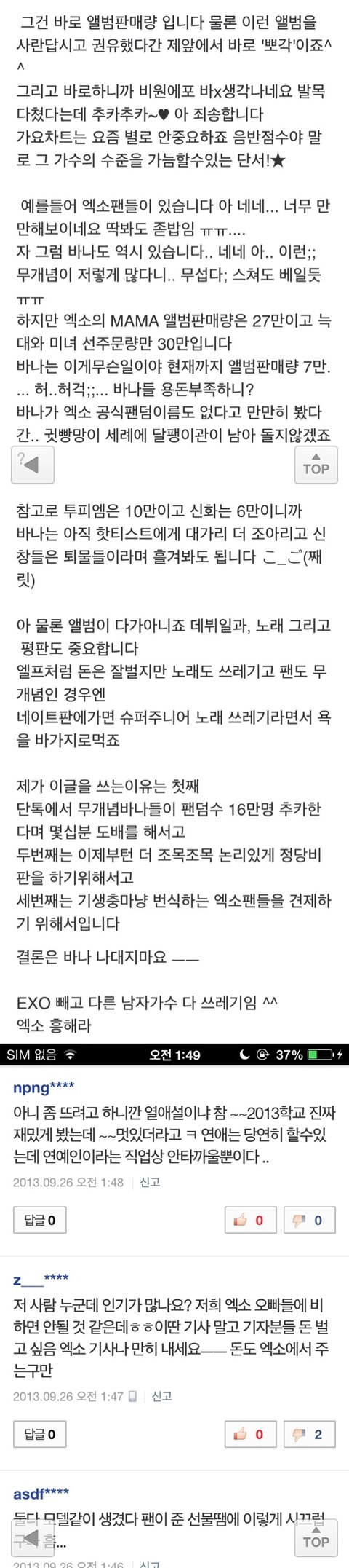 아니무슨바나가무개념이라ㅋㅋㅋㅋㅋ솔직히사생이랑무개념다따지고보면엑소팬무개념더많지안나요?ㅎ 개념팬은 누가자기팬들욕하면인정해주고하는게개념팬인데 여기글올린사람은무개념이네ㅎ 이게무슨일이야 앨범판매량이 7만명이뭐어떻다고그러는거지?ㅎ아니왜 엑소말고남자가수다쓰레인거죠?ㅎ