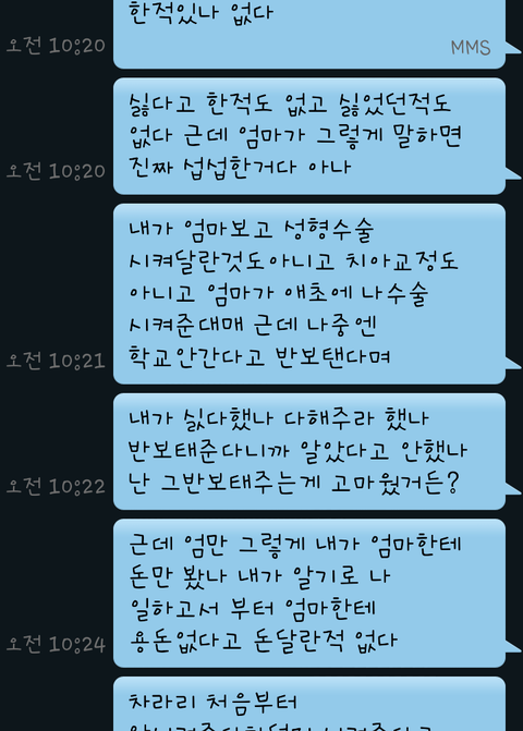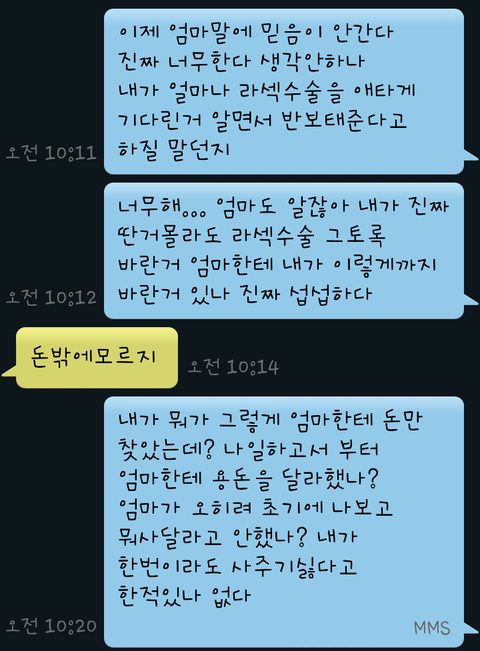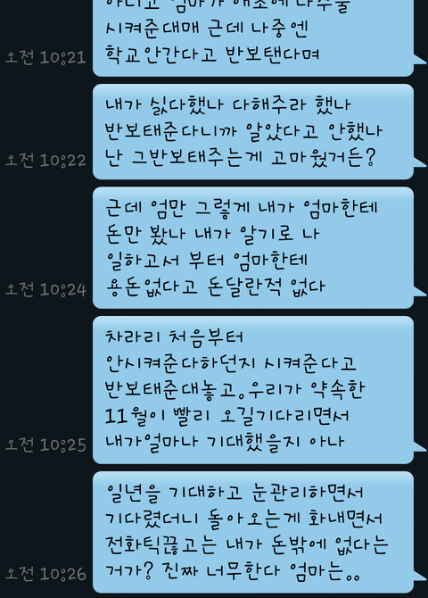 "내가 니대학비를 왜내? 니대학비는 느그 아빠보고 달라그래 엄만 돈없어 엄마가 아빠처럼 많이 벌고(많이 벌지도 못하심) 널키우고 있었다면 내 새끼 내 대학비는 모았을꺼야 참 진짜 그새끼도 사람 되긴 글렀어 미친 새*"