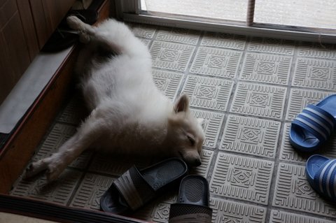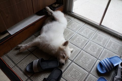 우리 멍이는 저렇게 뒷다리 쭉~ 뻗고 잘 누워있어요