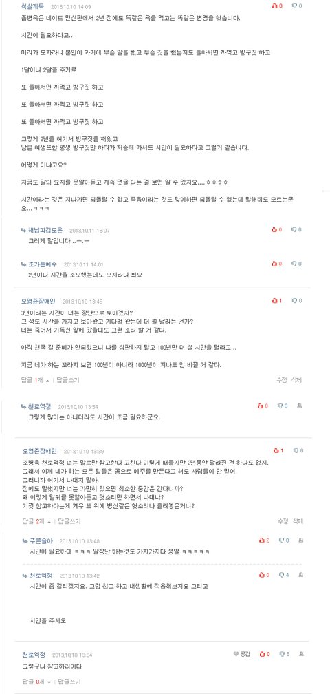 이 글로 가면 불과 한 달 전에 자신의 행동들을 고치겠다고 말한 천로역정 조영욱 군의 댓글들이 있습니다.