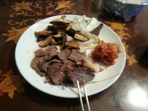 구운 가지나 볶은 양파를 먹고 고기에 김치는 필수구요.
