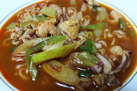 일반 라면에 생물 오징어 칼집 넣고
