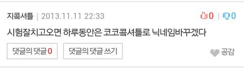 그대가 내 달팽이관에 속삭였지. 내가 시험을 잘 보고 돌아오는 목요일. 그 하루동안 그대는 닉네임을 change하기로..아 물론 하루동안이라는 조건이 있겠지만..난 그거하나로도 충분하다. enough★