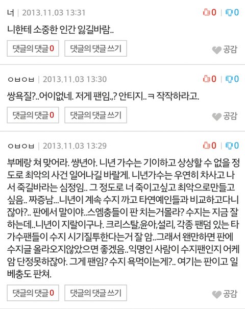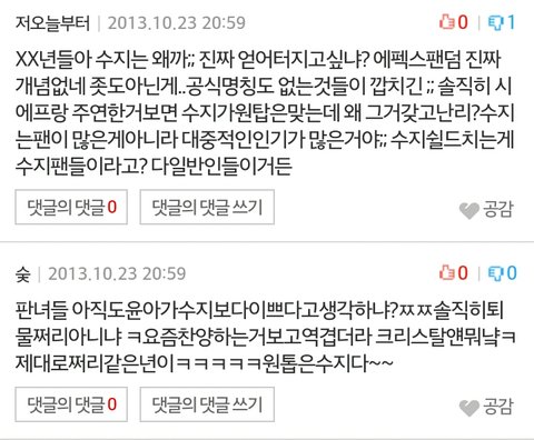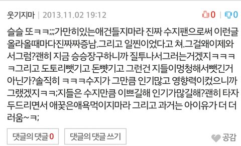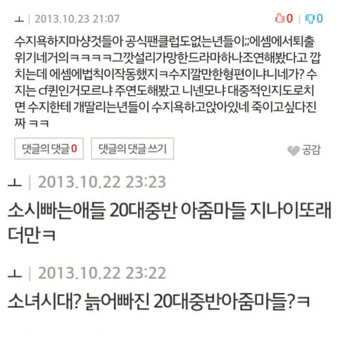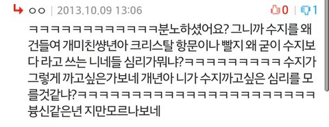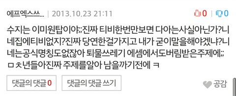 ↑수지 지능안티가 수지욕먹일라고 어떤글올리니깐 그지능안티가 소녀시대팬이라는 뉘앙스로 저렇게말함ㅋ소녀시대죽었으면좋겠다는식으로 댓글8개정도는 달아놨는데 일부분만캡쳐함