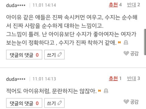 수지지능안티들이 쓴댓글은 안가져오고 진.짜 수지팬들이 쓴댓글들만가져옴.조금이라도 지능형안티의심되는건 아예안가져왔음ㅇㅇ