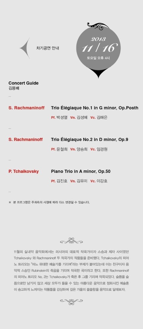11월의 실내악 음악회에서는 러시아의 대표적 작곡가이자 스승과 제자 사이였던 Tchaikovsky 와