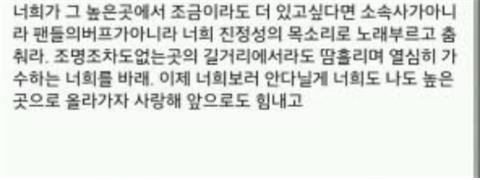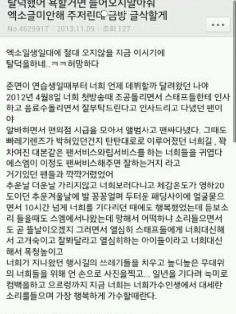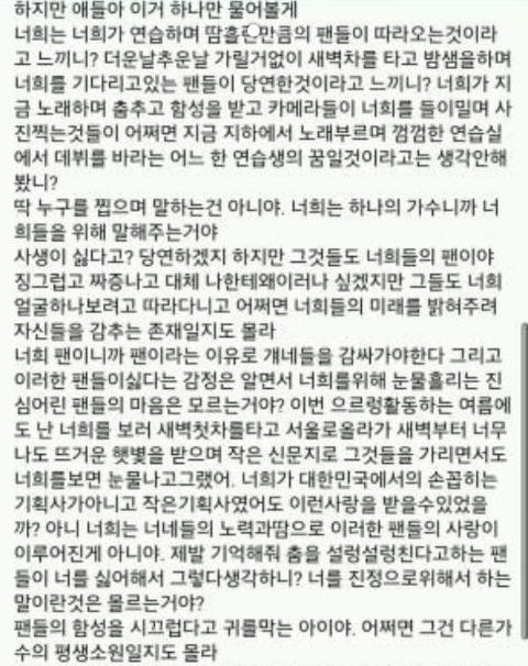 뭐 엑소 깎아내리려는게 아니라 그냥 돌아다니다가 이글을 봤는데 그냥 나도 한가수의 한팬으로써 뭔가 읽으면서 가슴이 절절하다.물론 난 사생이라면 질색하긴하지만 그냥 이글은 좀 슬픈듯.엑소 뿐만아니라 우리애들도 만약 이글을 읽으면 초심을 다시 한번 다잡으면 좋겠음괜히 기분 처지네...에휴
