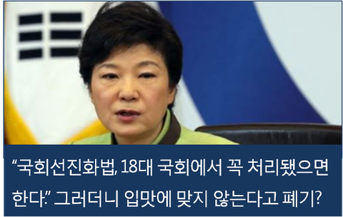 지난 19대 총선 직전 국회선진화법 통과를 강력하게 주장했던 사람 중 하나가 바로 박 대통령이다. 그래놓고도 여당에게 국회선진화법 무력화를 주문한다는 건 국민을 우롱하는 짓이다.