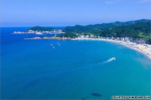 자그마한 해변이 반달처럼 휘어져 아담하며, 해변 뒤에는 소나무 숲이