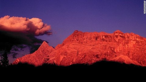 일몰 때 소멸되어 가는 태양빛에 암벽이 붉게 물드는
