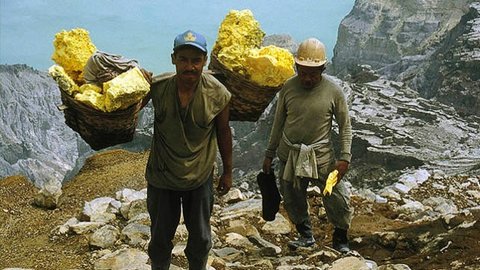 분화구로 내려가 새로 쌓인 황을 바구니에 담아 어깨에 지고 나온다.