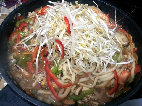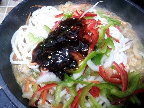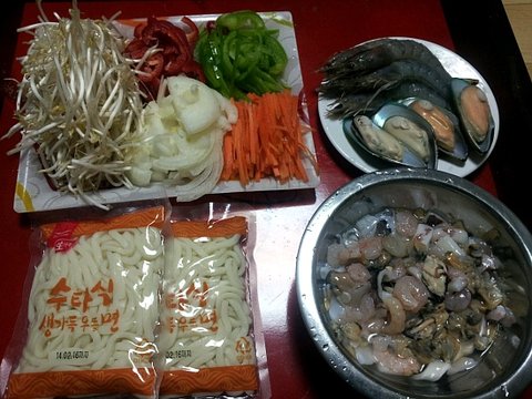 재료 : 우동면사리, 새우, 홍합, 오징어, 바지락살, 양파, 파프리카, 피망, 당근, 숙주나물, 마늘!!