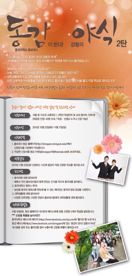 동국대학교 홍보대사 동감이 예비고3들을 위해 야식행사 이벤트를 준비하고 있습니다ㅎㅎ많은 참여부탁드려요!!