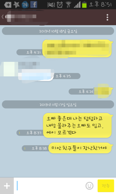 어제 데이터 끄고 카톡으로 개소리를 지껄이며 놀다 실수로 첫번째 카톡을 보냄. 전송취소가 안됨. 망함. 그래서 마침 옆에 동생들도 있고 하니 그냥 보내고 애기들이 보냈다고 했음.