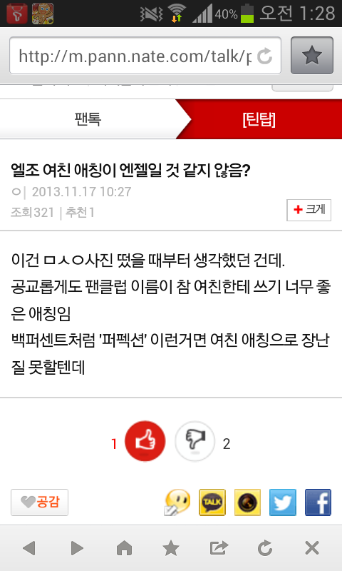 공교롭게도 팬클럽 이름이 여친애칭으로 쓰기에 딱좋대랰ㅋㅋㅋㅋㅋㅋㅋ웃기고있네ㅋㅋㅋㅋㅋㅋ시대 역행하냐ㅋㅋㅋ엔젤을 어떻게 여친애칭으로쓰냐? 중세시대 살다가왔나.. . 한번 색안경끼고 보니까 이딴식으로도 나오는구나...딴건 몰라도 찬희가 지어준 이름은 건드리지 말아줄래;;