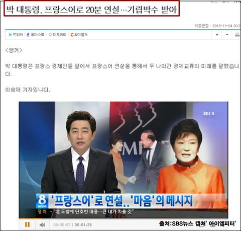 지난 11월 4일 SBS 8시 뉴스에서는 박근혜 대통령이 프랑스 경제인들 앞에서 프랑스어로 연설했고, 이는 마음의 메시지였으며 기립박수를 받았다고 보도했습니다.