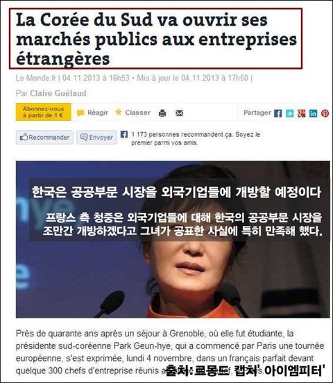 프랑스 르몽드지는 박근혜 대통령의 연설을 소개한 11월 4일자 기사의 제목을 '한국은 공공부문 시장을 외국기업들에 개방할 예정이다'라고 했습니다. 르몽드지는 300여명의 프랑스 청중 (프랑스기업인들 모임 (메데프)들이 외국기업들에 대해 한국의 공공부문 시장을 조만간 개방하겠다고 박근혜 대통령이 공표한 사실에 특히 만족했다고 전했습니다.